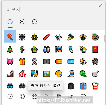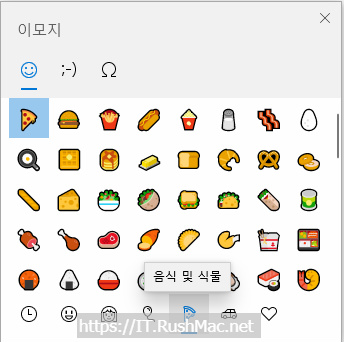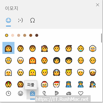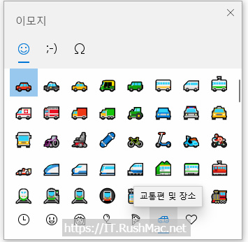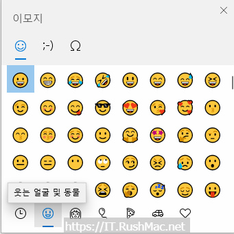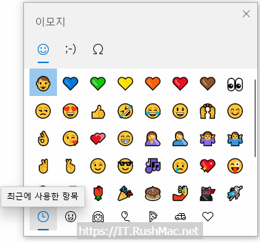윈도우에서는 이모지 아이콘을 추가 되어, 텍스트 중에 쉽게 이모지 아이콘을 입력할 수있습니다. 이모지 하단에 7개 탭으로 구성 되어 있습니다.