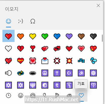 윈도우에서는 이모지 아이콘을 추가 되어, 텍스트 중에 쉽게 이모지 아이콘을 입력할 수있습니다. 이모지 하단에 7개 탭으로 구성 되어 있습니다.