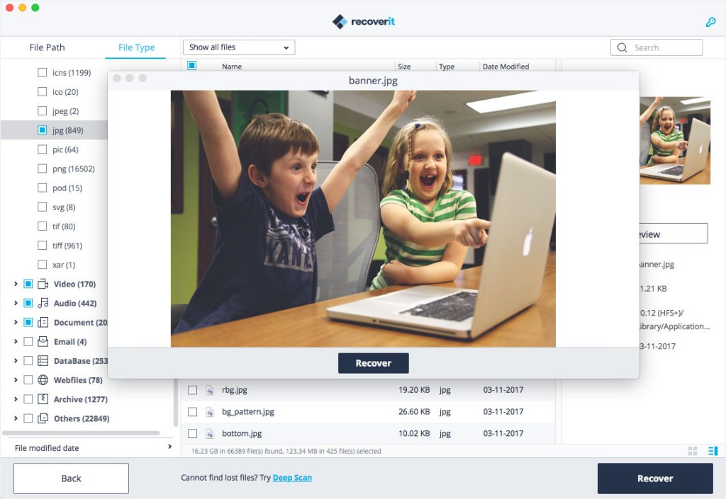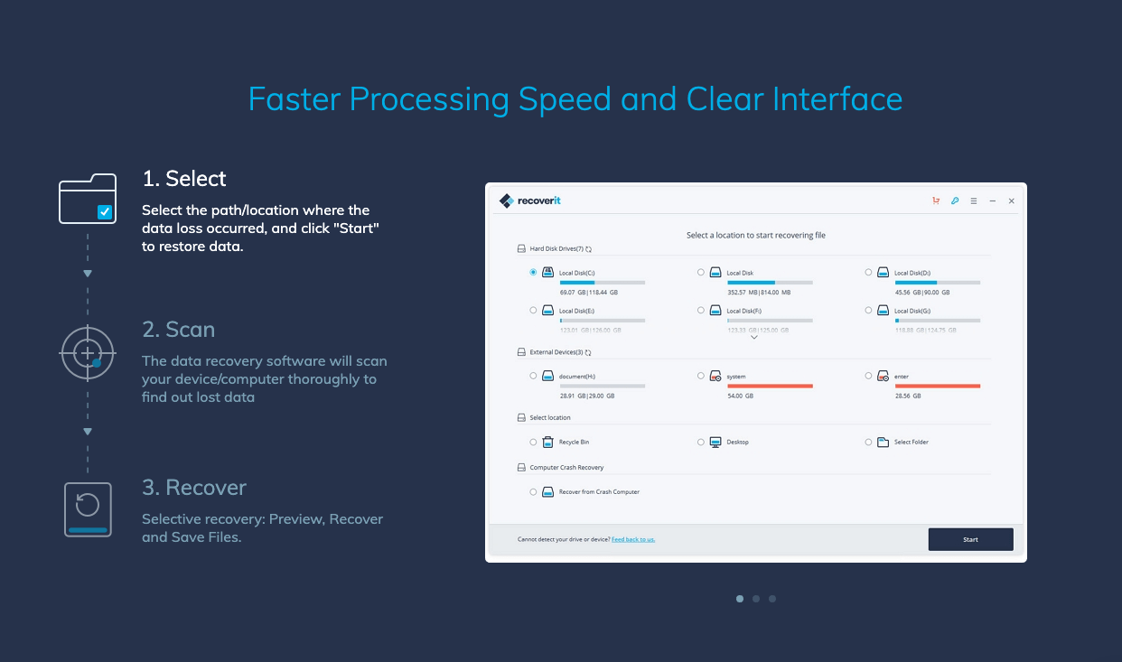 Recoverit는 사용자가 충돌 및 기타 시스템 문제로 인해 마지막에 발생했을 수 있는 사진, 비디오, 오디오, 이메일, 문서 등을 찾아 복구할 수 있도록 파일을 매우 쉽고 안내 받을 수 있는 프로세스를 제공합니다.