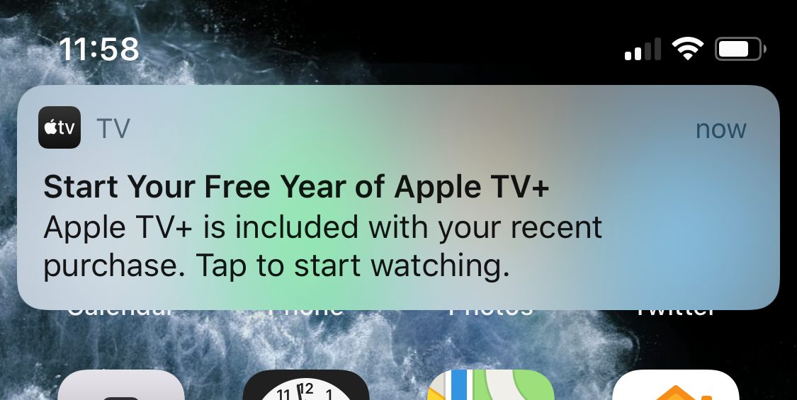 Apple은 제안에 대한 인식을 높이기 위해“Apple TV + 무료 연도 시작”이라는 제목의 알림을 발송했습니다.