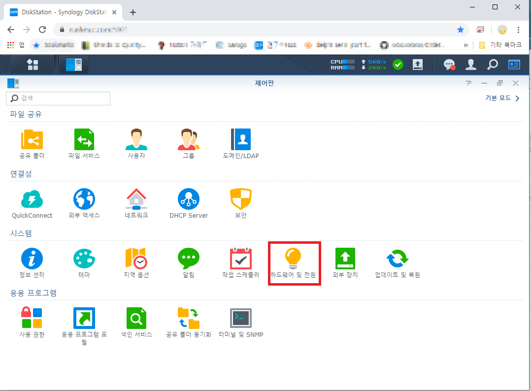 1) 시놀로지의 Disk Station에 접속한 후 제어판 실행 후 하드웨어 및 전원 실행 합니다.