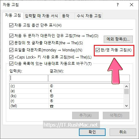- 기본적으로 한/영 자동 고침 옵션이 체크박스가 체크가 되어 있습니다. 이 부분 대해 체크를 해제 후 확인 클릭 합니다.
