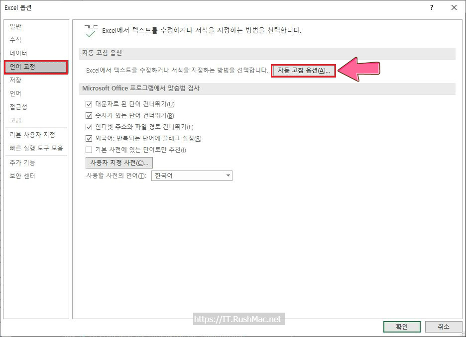 - Excel 옵션 설정 할수 있는 메뉴 리스트 있습니다. 이 중에 [언어 교정] > [자동고침 옵션] 선택 합니다.