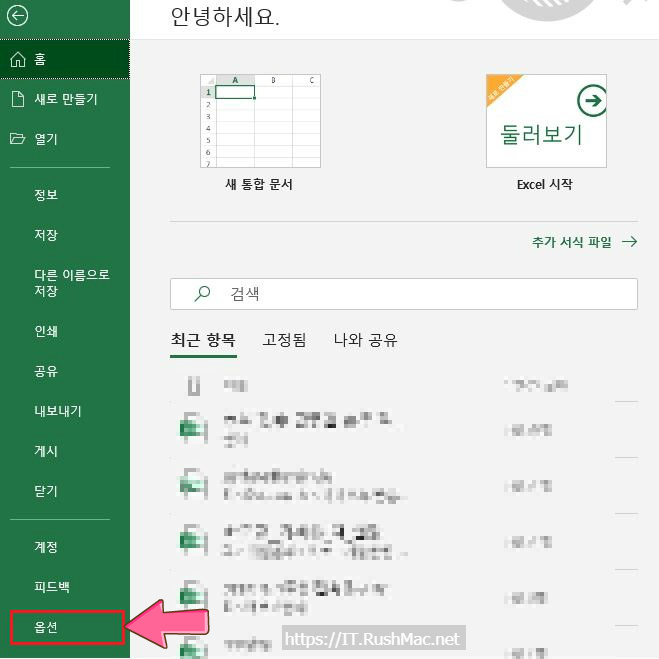 - 파일 메뉴 클릭 후 하단에 [옵션] 버튼 클릭합니다.
