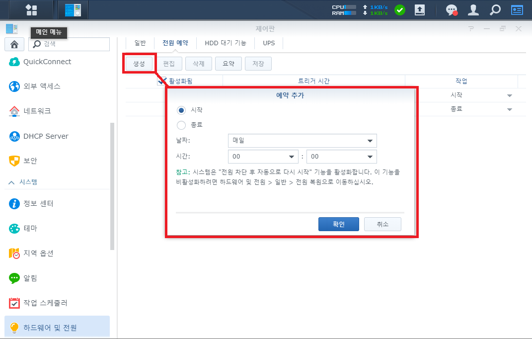 시놀로지나스에는 전원 예약 기능이 있습니다.
