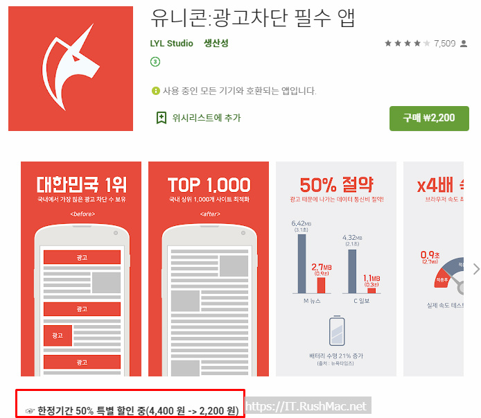 유니콘:광고차단 필수 앱 -(4,400 원 -> 2,200 원) 50%할인중
