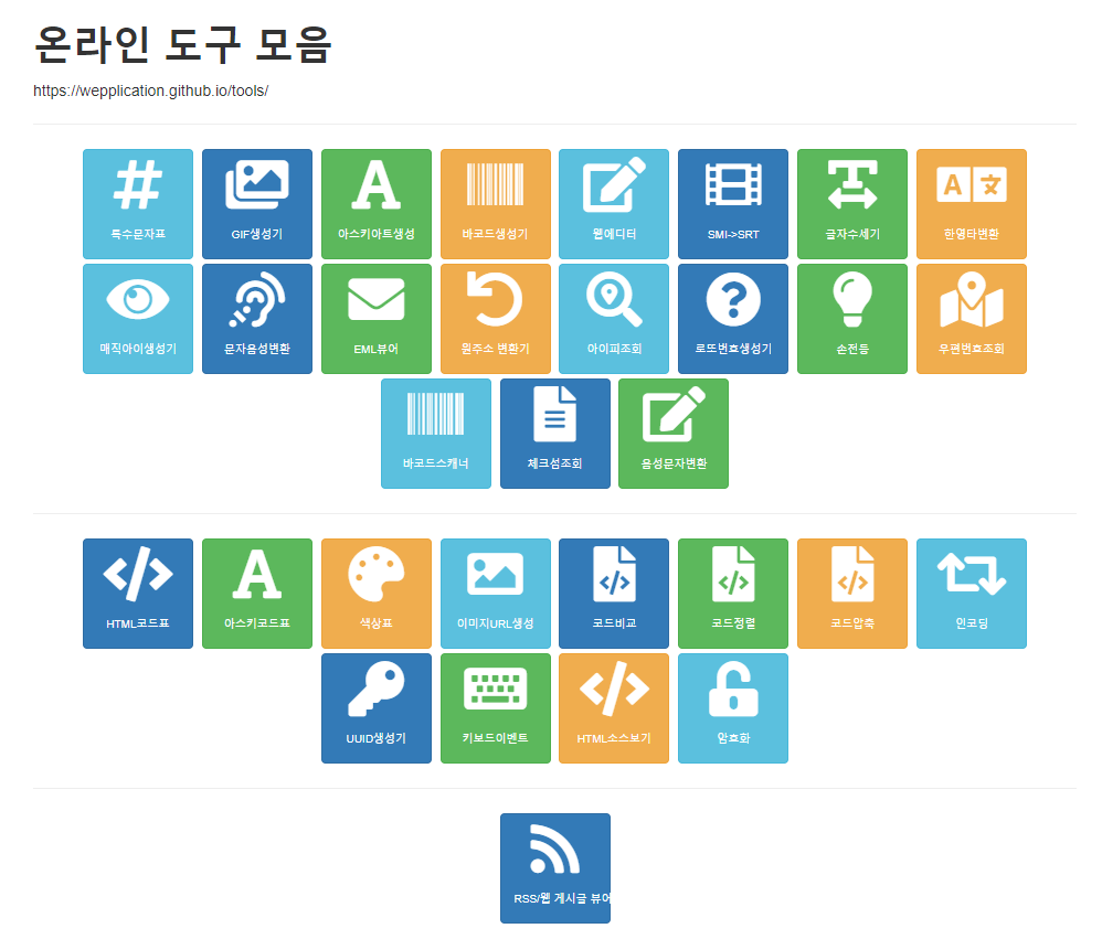 온라인 모음 사이트에서 다음과 같이 [#특수문자표, #움직이는 GIF생성기, #아스키아트 생성기, #바코드 생성기, #웹에디터, #smi -> srt 자막 변환기, #글자수세기, #한영타변환, #매직아이생성기, #문자음성변환, #EML뷰어,짧은주소url 원래주소 변환, #아이피조회, #로또번호 생성기, #손전등, #우편번호 찾기, #바코드 스캐너, #체크섬(MD5) 조회, #음성 문자 변환, #html 코드표, #아스키코드표, #색상표, #이미지URL생성기, #코드비교, #코드정렬, #코드압축, #URL인코딩, #UUID생성기, #키보드 이벤트 테스트, #HTML 소스보기, #암호화 도구] 기능 이용 합니다.