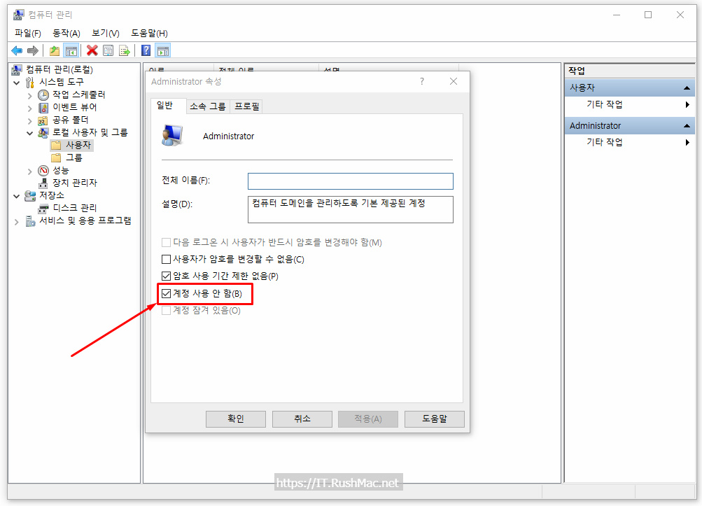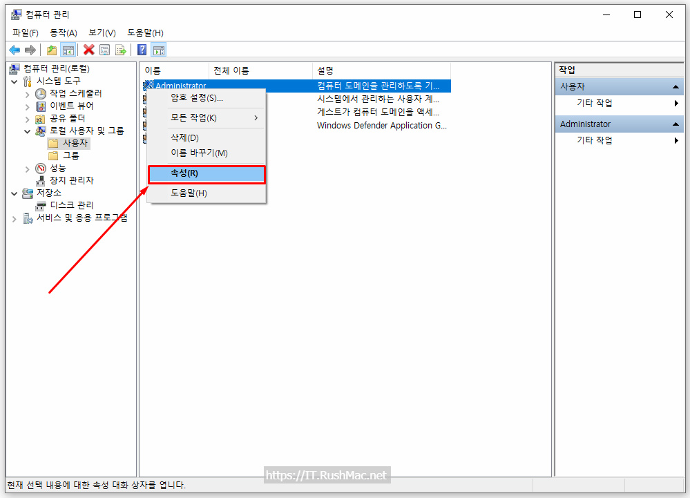 - Administrator 계정 우클릭으로 [속성] 선택 합니다.