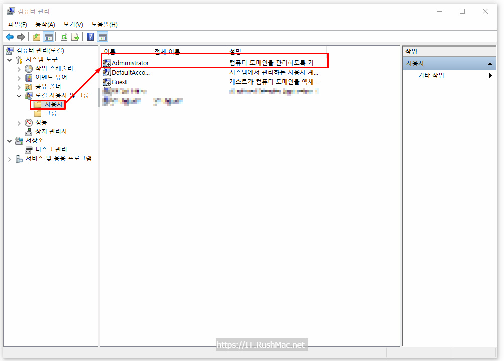 - [로컬사용자및그룹] -> [사용자] 항목 선택합니다.