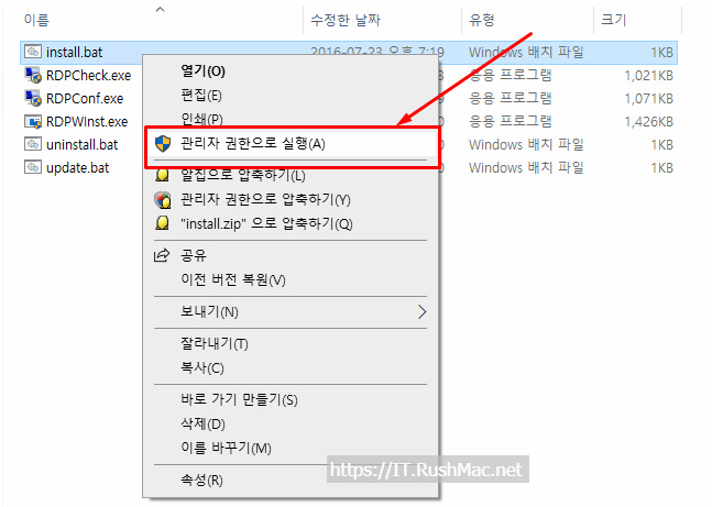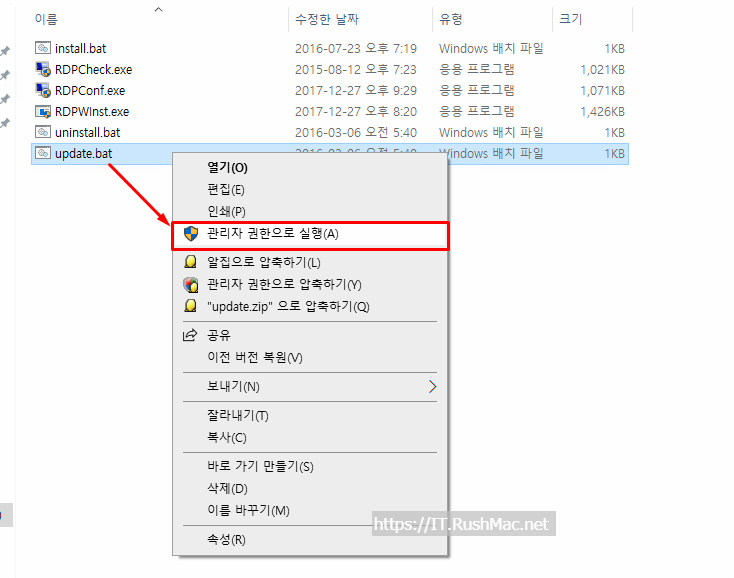 - Update.bat 파일을 관리자 권한으로 실행 합니다.