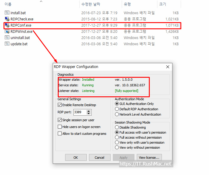 - RDPconf.exe 파일 실행 후 정상적으로 설치가 완료 되었는지 체크 하기 위해 실행 합니다.