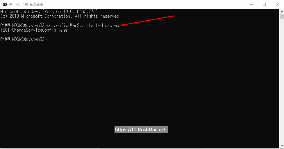 2. 명령어 [sc config WerSvc start=disabled] 실행 합니다.
