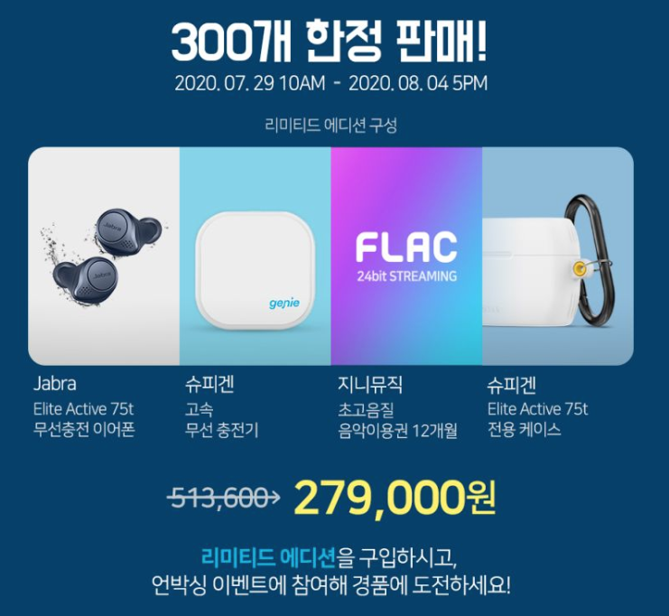 7월 29일 오전 10시부터 ~ 8월 4일 오후5시까지 지니뮤직에서 300개 한정, 45% 할인된 금액으로 자브라 엘리트 액티브 75T 구매할수 있습니다. [자브라 블루투스 이어폰(Jabra Elite active 75t wireless)과 슈피겐 고속 무선 충전기, 슈피겐 실리콘 전용 케이스, 지니뮤직 초고음질 음악 감상 12개월 이용권까지 구성 되었습니다.