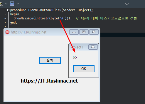 ShowMessage(inttostr(byte('A'))); // A문자 대해 아스키코드값으로 전환