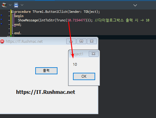 ShowMessage(intToStr(Trunc(10.7154477))); //다이얼로그박스 출력 시 -> 10