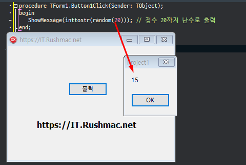 ShowMessage(inttostr(random(20))); // 정수 20까지 난수로 출력