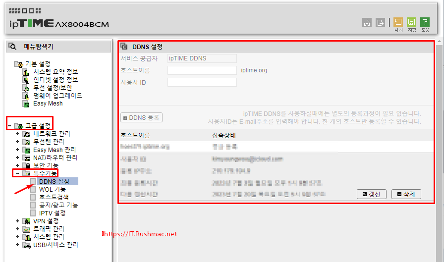 3. 아이피타임 설정 초기 화면에서 고급설정>특수기능> DDNS설정으로 이동 합니다.