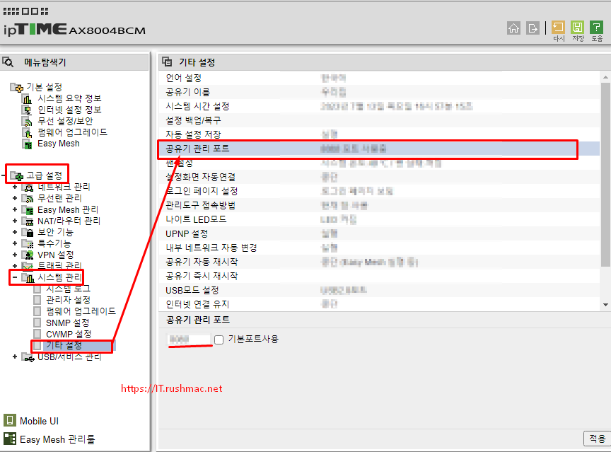 4. 마지막 단계 외부에서 접속 할 수 있도록 공유기 관리 포트 설정페이지로 이동 합니다.( 고급설정>시스템관리>기타설정)
