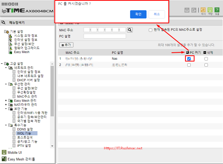아이피타임공유기에서 나스(synology) 전원 켜기