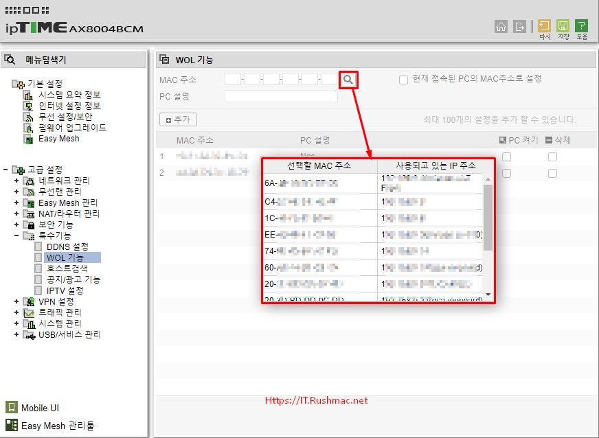 • 아이피타임 공유기 설정에서 고급설정>특수기능>WOL 기능으로 이동 합니다.
