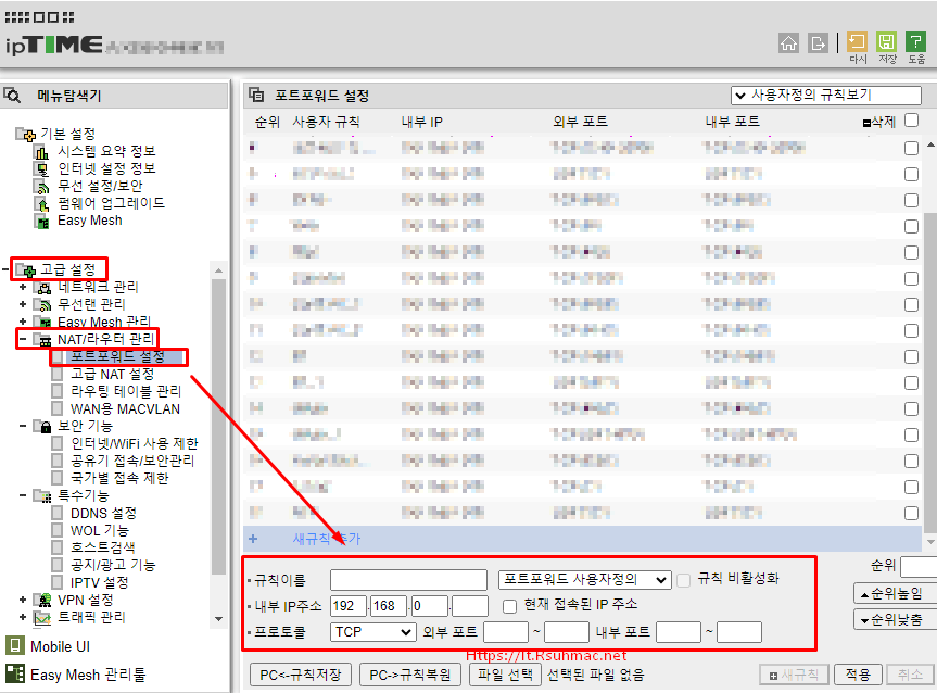 저가 이용중인 아이피타임(IpTime) 공유기 설정에서 고급설정> NAT/라우터관리> 포트포워드설정 이동합니다.