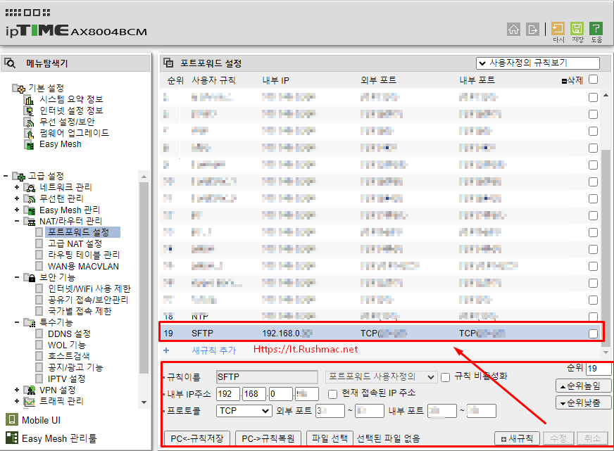 규칙이름, 내부IP주소(시놀로지IP), 프로토콜 TCP 지정, 외부 포트(시놀로지에서 STP 지정 포트) 각각 항목 입력하면 됩니다