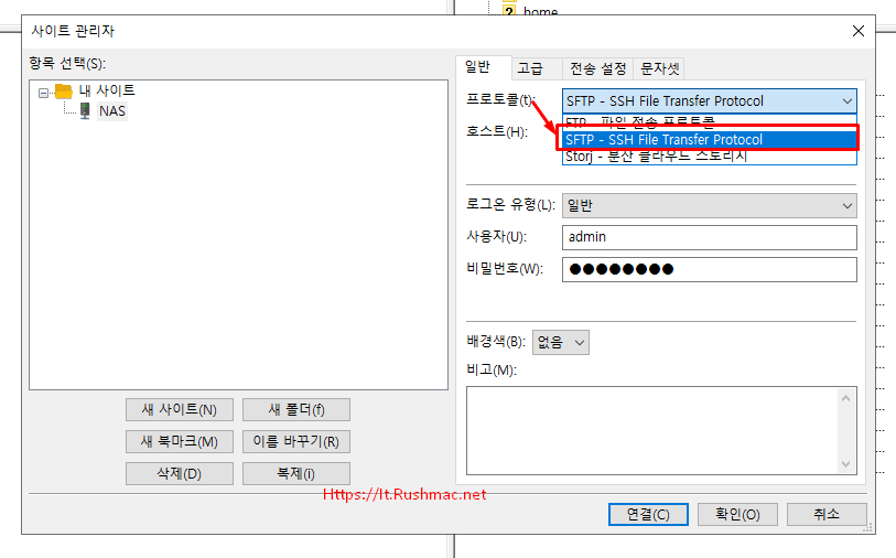 파일질라 세팅 - 프로토콜 옵션 중 SFTP 선택합니다.