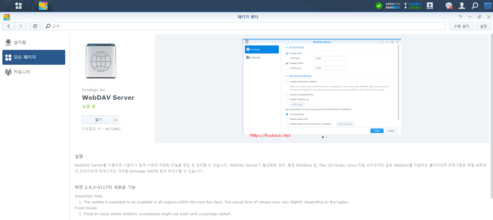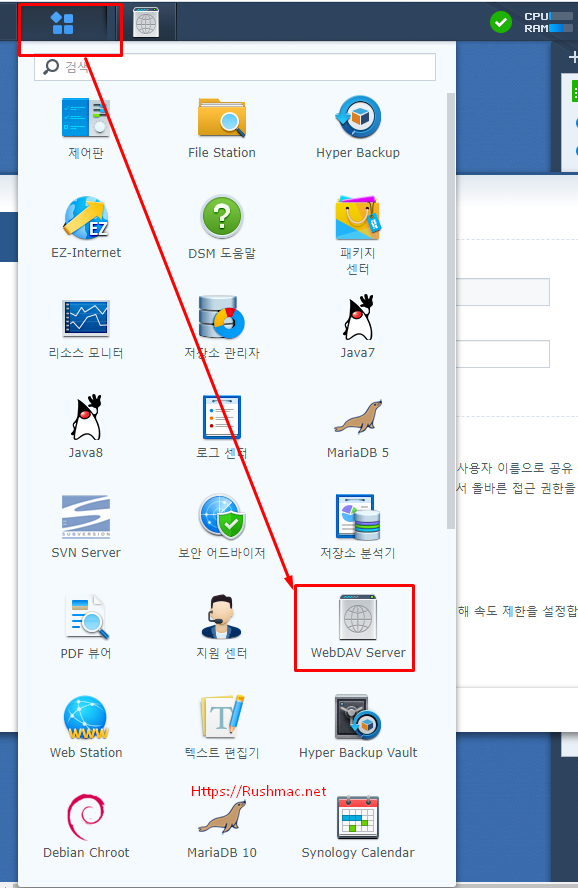- 패키지센터 통해, WebDAV Server 설치 합니다.