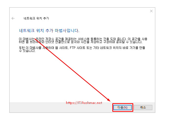 - 네트워크 위치 추가 마법사 메뉴가 실행 됩니다. 여기서 다음버튼 클릭 합니다.