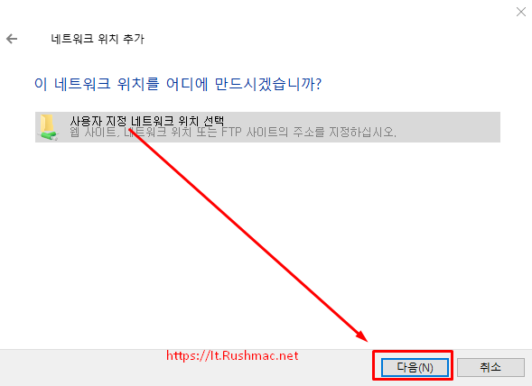 - 네트워크 위치 추가 마법사 - 네트워크 위치를 어디에 만드시겠습니까? 화면에서 다음 클릭 합니다.