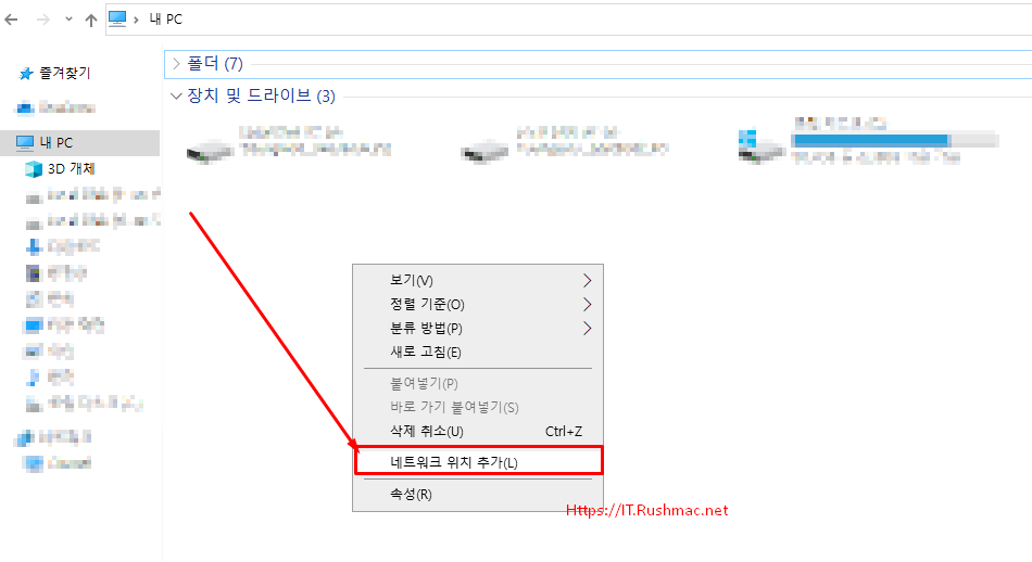 - 윈도우 탐색기에서 우측 마우스 클릭하여 네트워크 위치 추가(L) 항목 클릭합니다.