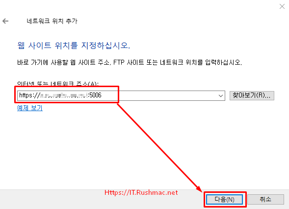 - 여기서 직접 주소입력창에 https://시놀로지 주소:webDAV포트번호 입력 후 다음 버튼 클릭합니다.