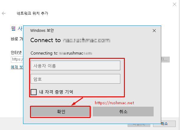 - 정확하게 주소 입력 되시면 WevDAV 성공완료 후 로그인정보 입력창(사용자이름,암호,내 자격증명)이 출력 되어 필수 항목 입력 하여 확인 버튼 클릭 합니다.