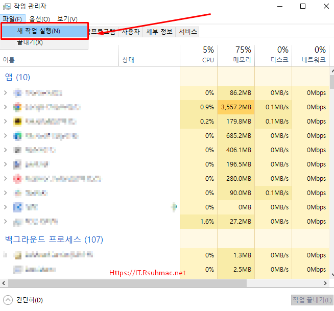 - 작업관리자 상단 메뉴에서 파일 > 새 작업 실행 옵션을 선택 합니다.