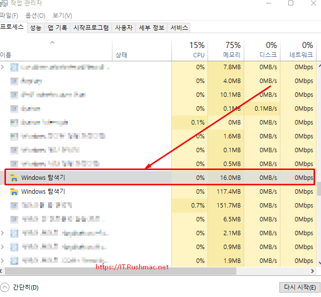 - "Ctrl + Alt + Del"키 눌러 작업관리자를 구동해서 Windows 탐색기를 찾습니다.