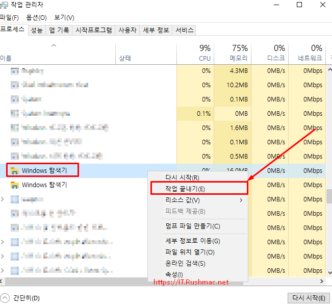 - Windows 탐색기 - 마우스 우측 버튼 클릭으로 "작업 끝내기" 선택 합니다.