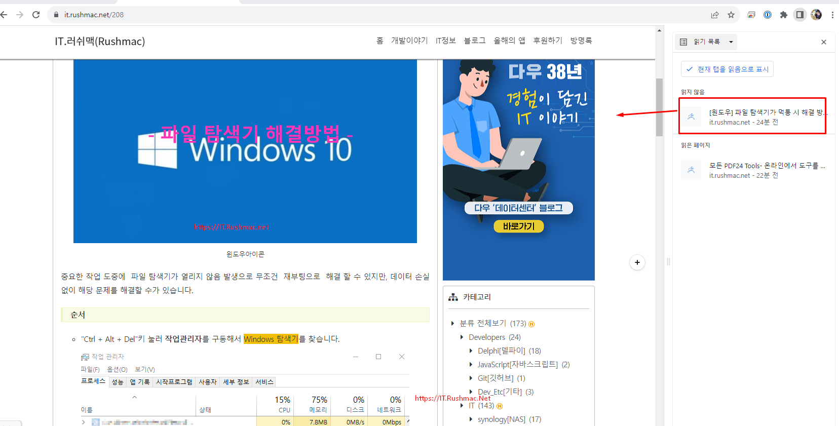 - 읽지 않은 웹페이지 클릭 시 좌측 웹브라우저로 해당 페이지 이동 합니다.