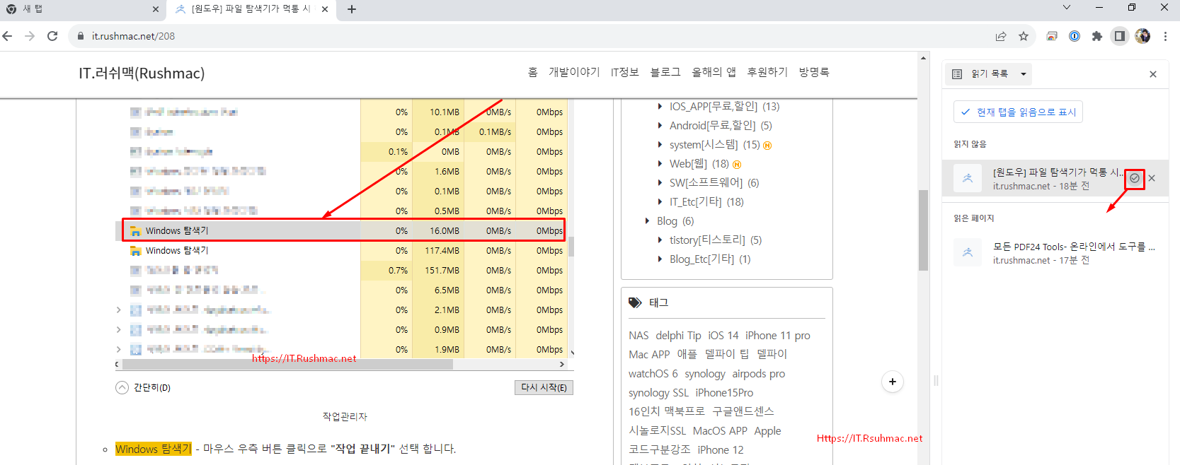 - 읽지 않은 웹페이지 클릭 시 좌측 웹브라우저로 해당 페이지 이동 합니다.