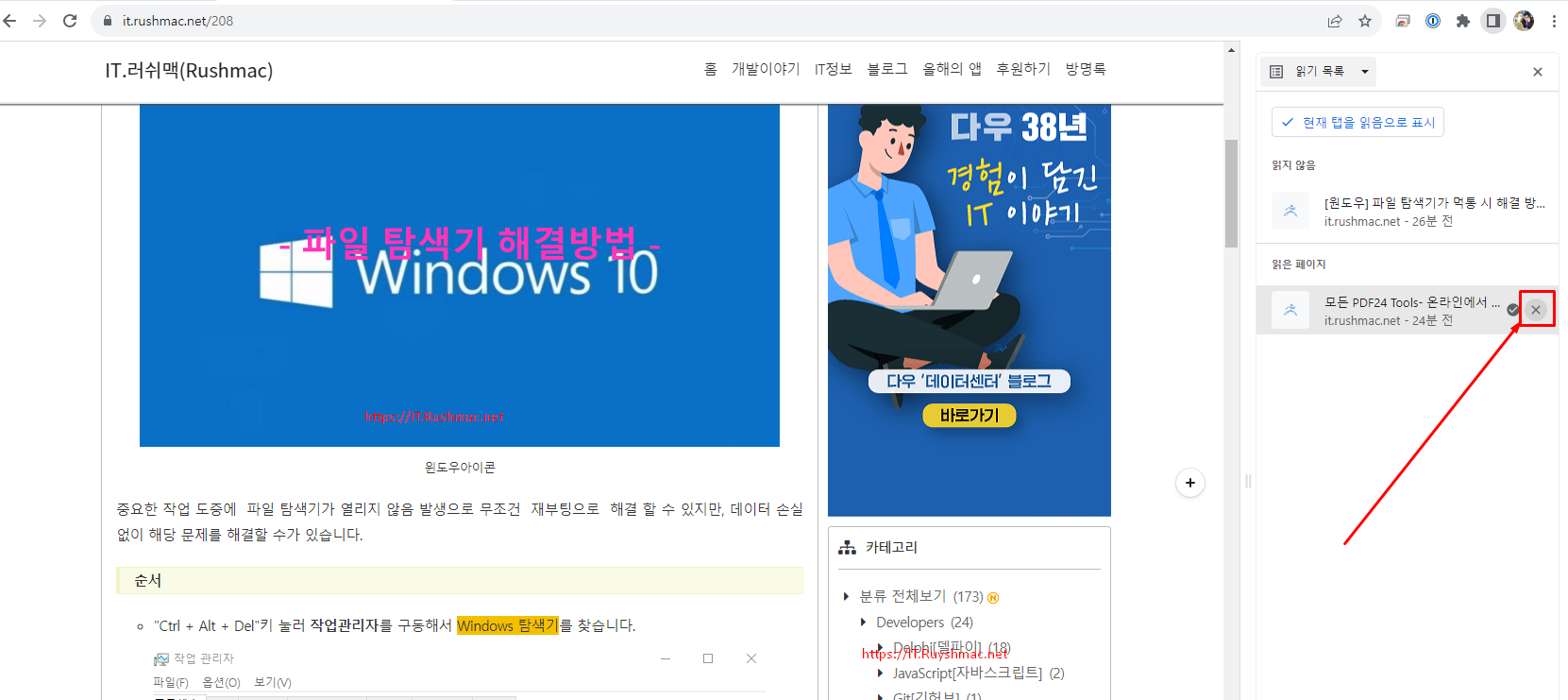 - 읽지 않은 페이지에서 해당 웹사이트 내용 모두 읽었다고 판단이 되면 다음과 같이 아이콘 클릭으로 읽은 페이지로 이동 됩니다.