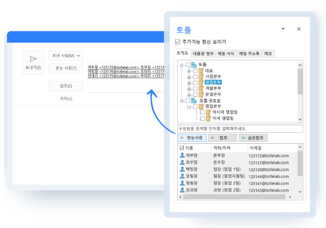 대용량 파일 첨부, 조직도, 수신확인, 개별발송 등 30여가지 아웃룩 확장 도구를 토틀에서 만나보세요!