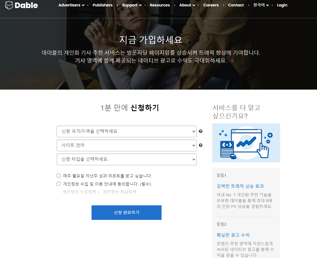 - 신청 페이지로 이동 합니다.(https://dable.io/ko/contact_media/)