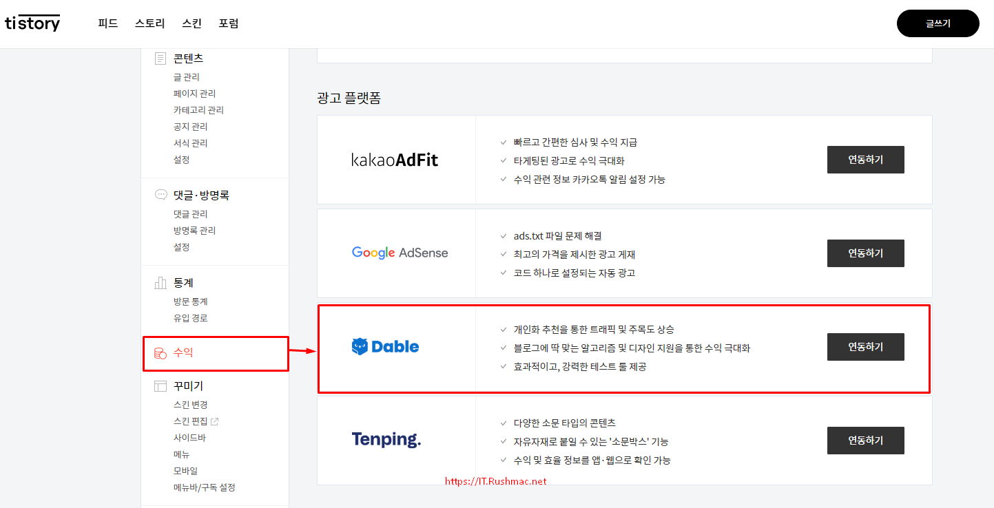 티스토리 관리 메뉴에서 신청 가능합니다. 수익> 데이블(Dable) 광고 플랫폼 연동 하기 클릭 합니다