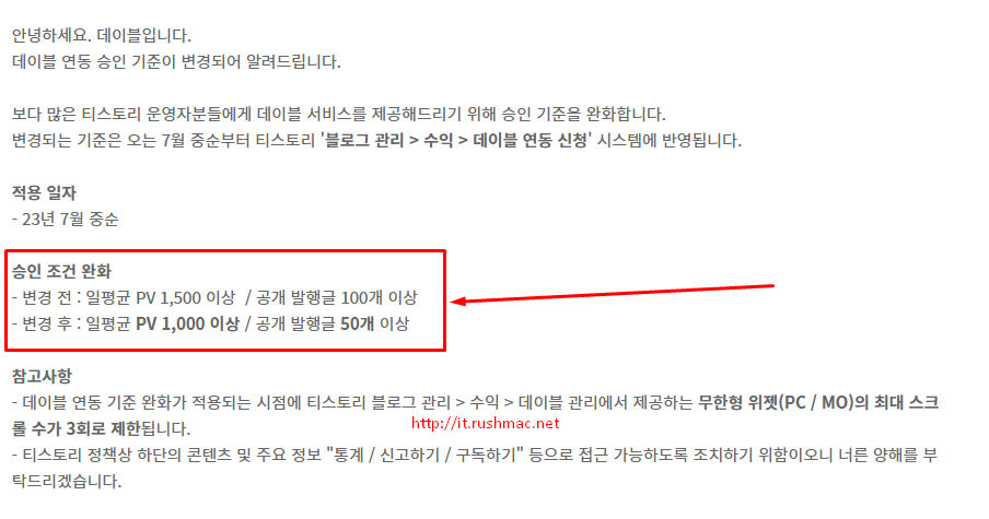 변경 후 : 일평균 PV 1,000 이상/ 공개 발행 글 50개 이상
