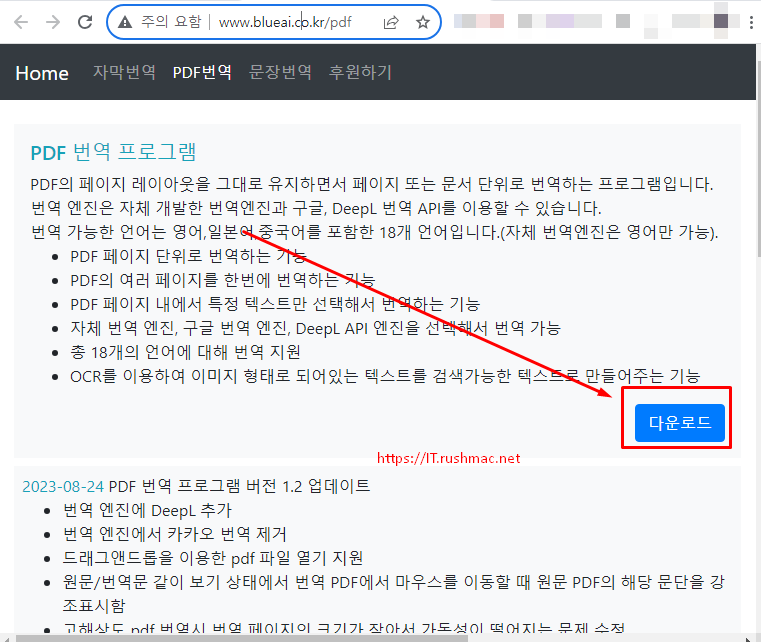 2023-08-24 PDF 번역 프로그램 버전 1.2 업데이트 2023-01-04 PDF 번역 프로그램 버전 1.1 업데이트 2022-03-10 서버 이전 PDF 번역 기능 추가 영한 번역 엔진 업데이트 Youtube 번역, OCR 관련 기능 제거