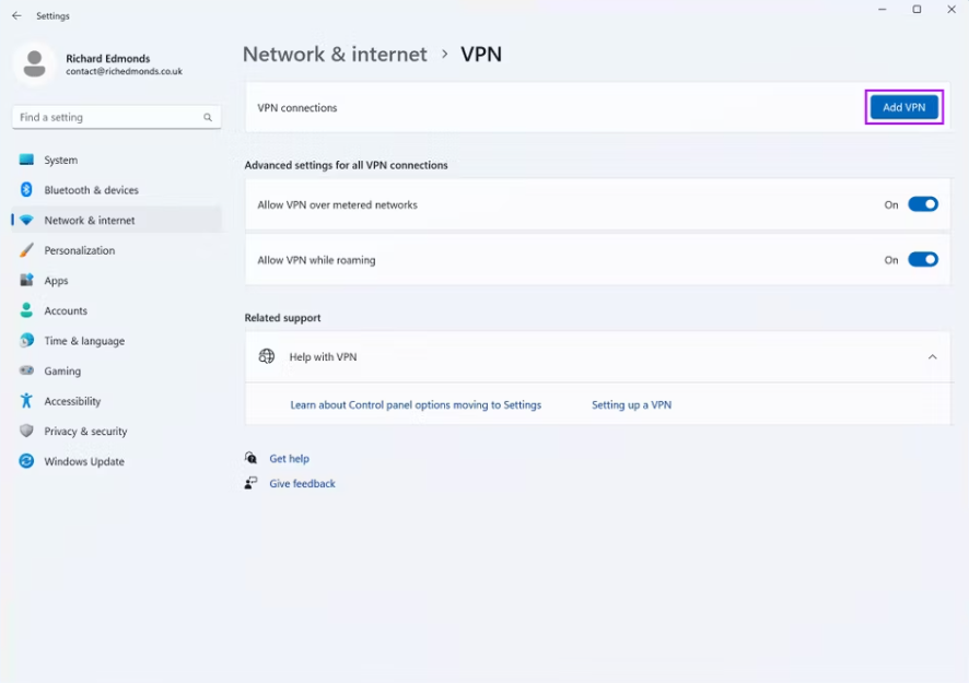 3. VPN 연결에서 VPN 추가를 클릭합니다