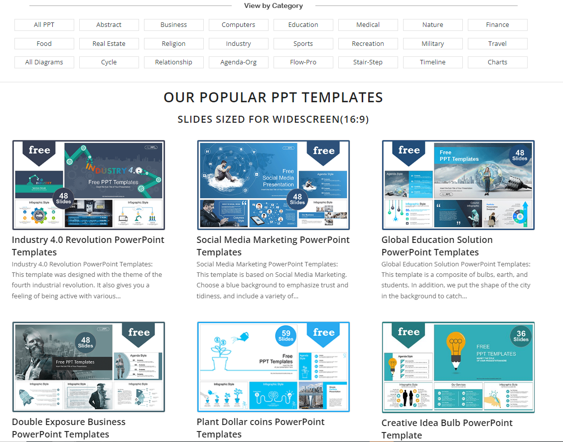 와이드스크린(16:9)에 적합한 슬라이드 크기로 템플릿를 검색 및 다운로드 가능하고, 카테고리로 항목을 선택도 가능합니다.