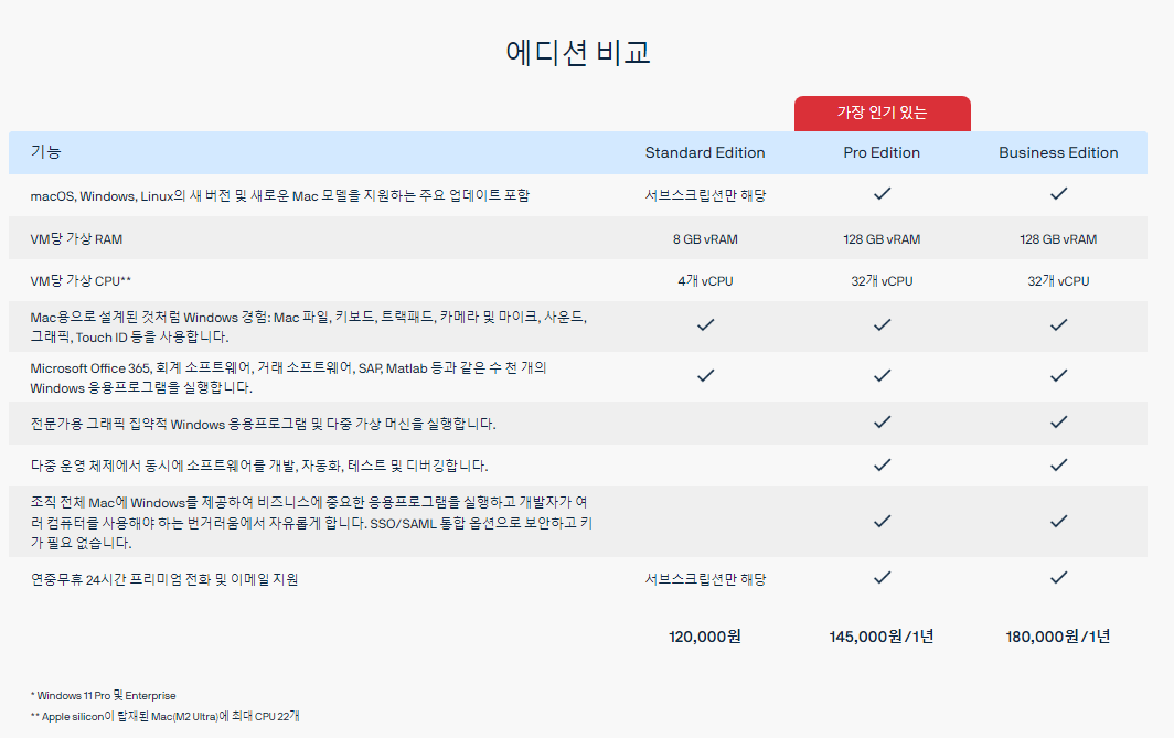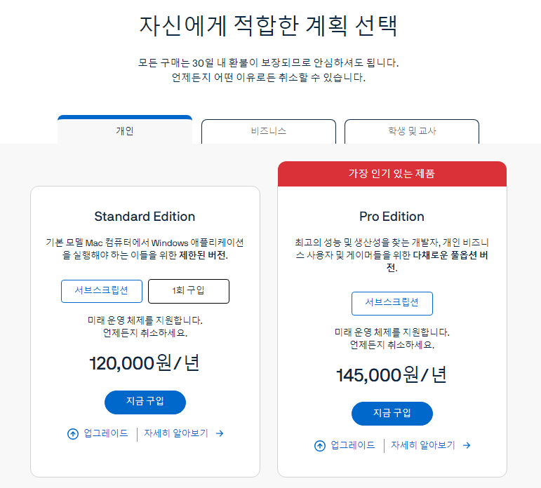 Mac에서 Windows11 무조건 실행할 경우, macOS, Windows 또는 Linux VM을 생성할려는 경우, 연간 구독 또는 영구 라이센스 비용을 지불할 수 있는 경우에는 구입해도 좋을 것 같지만, 그 외는 구매 안 해도 됩니다.