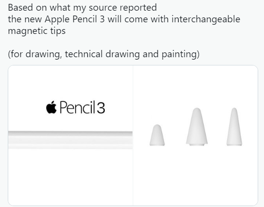 Apple 다음 스타일러스 버전 소비자에게 Apple Pencil 작동 방식을 조정할 수 있는 유사한 기능을 제공할 수 있습니다. 트윗에서 Apple Pencil 3가 교체 가능한 자석 팁과 함께 출시될 것이라고 합니다.