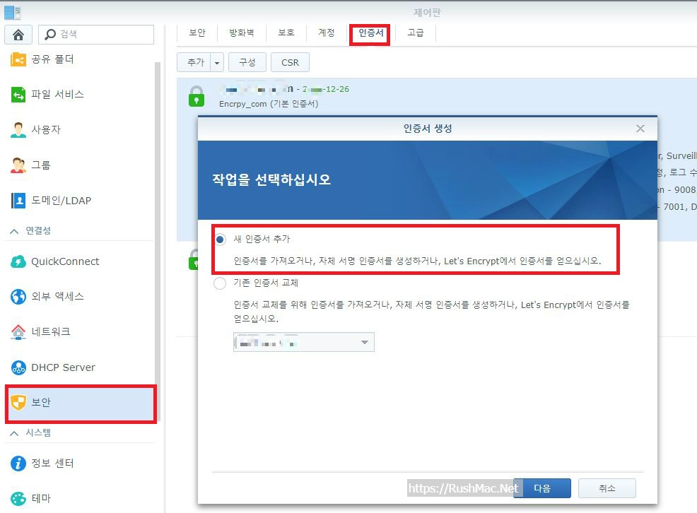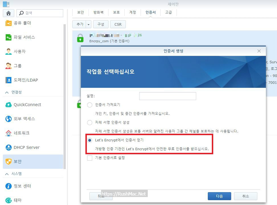 synology 구매한 도메인 대해 인증서(ssh) 등록 방법<let's encrypt 기관>