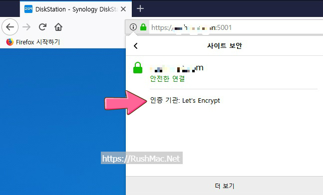 firefox 브라우저 실행 이후 발급 인증기간 let's encrypt 표기되는 것 확인 가능합니다.